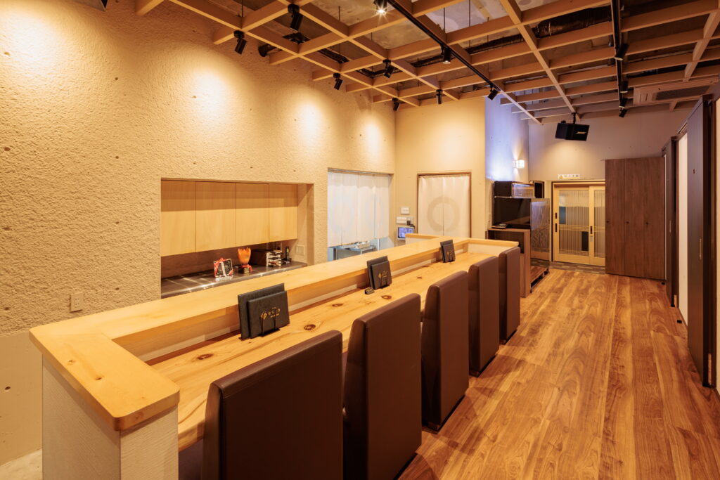 当店は、カウンター席5席と個室、半個室を6室ご用意しております。カウンター席では、明るく開放的にお料理をお楽しみいただけます。